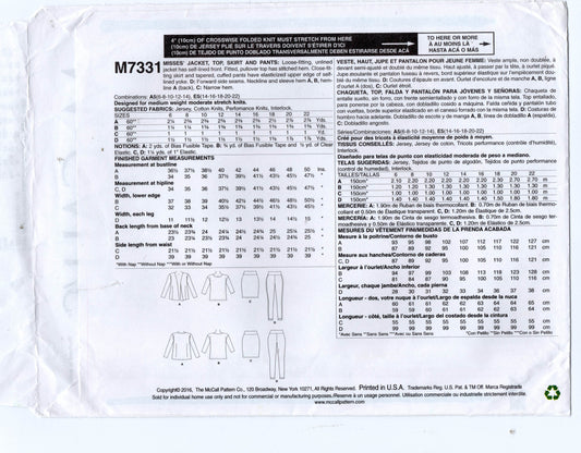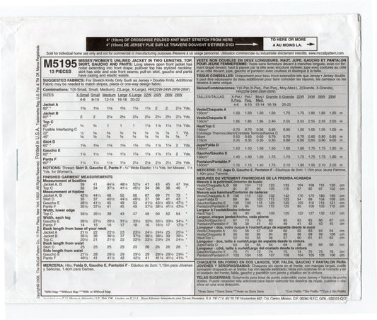Patrón de costura McCall's 5195 de chaqueta, top, falda y pantalones elásticos fáciles de usar para mujer, talla grande, sin cortar, doblado de fábrica, talla L XL