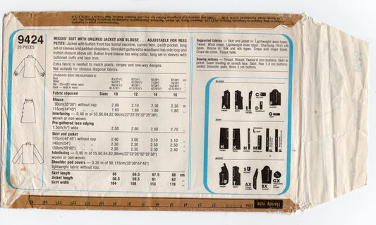 Patrón de costura vintage de los años 80 para traje de falda y blusa para mujer Simplicity 9424, talla 14, busto de 36 pulgadas