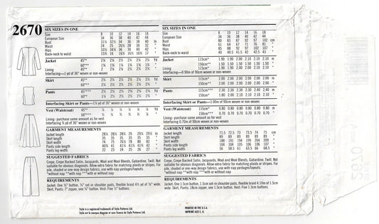 Style 2670 Womens Jacket Vest Pants & Skirt 1990s Vintage Sewing Pattern Size 8 - 18 UNCUT Factory Folded