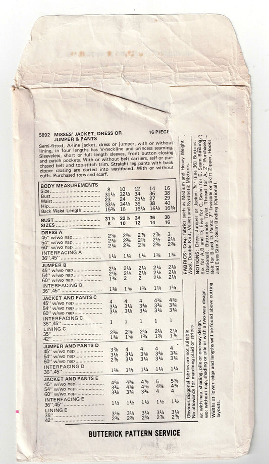 Butterick 5892 Womens Jacket Vest Dress Jumper & Pants 1970s Vintage Sewing Pattern Size 12 Bust 34 inches UNCUT Factory Folded
