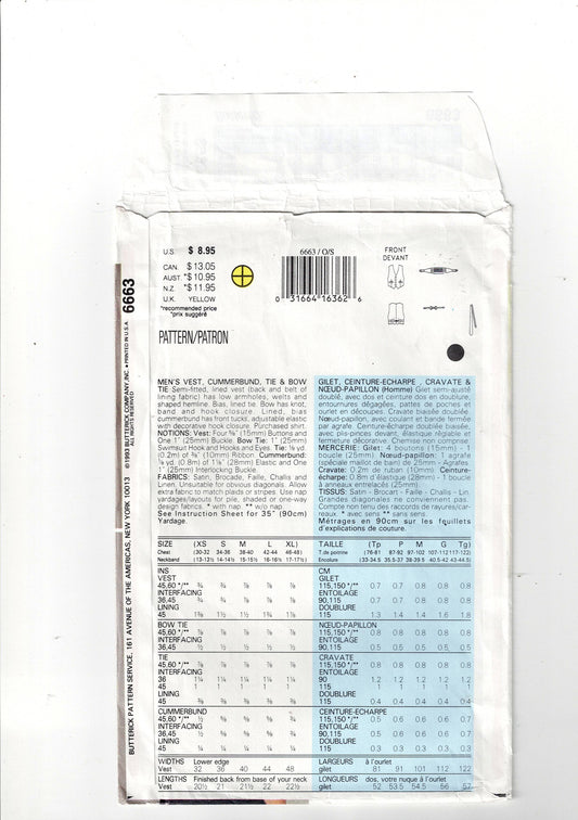 Butterick 6663 Mens Cummerbund Vest & Bow Ties 1990s Vintage Sewing Pattern ONE SIZE UNCUT Factory Folded