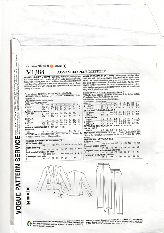 Vogue American Designer 1388 ANNE KLEIN Womens Tailored Pants Suit Out Of Print Sewing Pattern Size 16 - 24 UNCUT Factory Folded