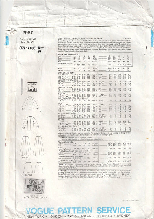 Vogue Couturier Design 2987 GALIZTZINE Womens Wide Collar Jacket Skirt & Pants 1970s Vintage Sewing Pattern Size 14 Bust 36 inches