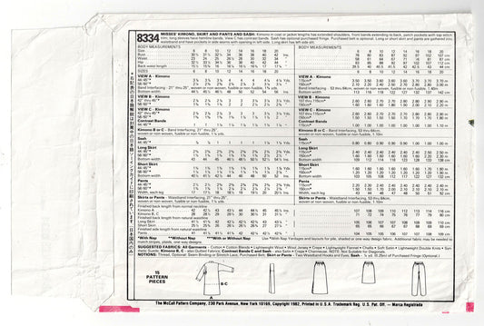 McCall's 8334 Womens Contrast Edged Kimono Skirt & Pants 1980s Vintage Sewing Pattern Size 14 Bust 36 inches UNCUT Factory Folded