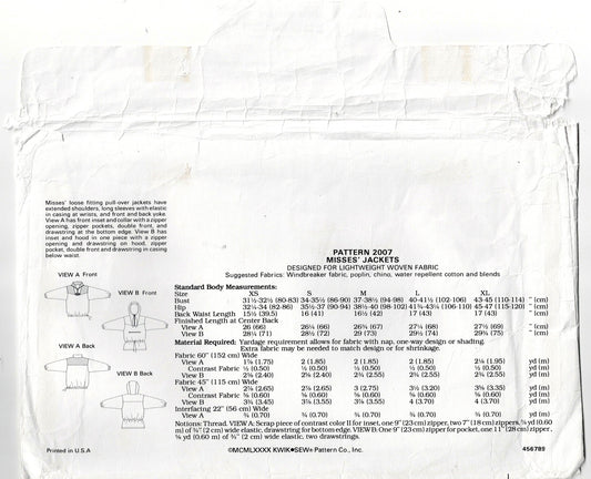 Kwik Sew 2007 Womens Color Blocked Wind Jackets 1980s Vintage Sewing Pattern Size XS - XL UNCUT Factory Folded