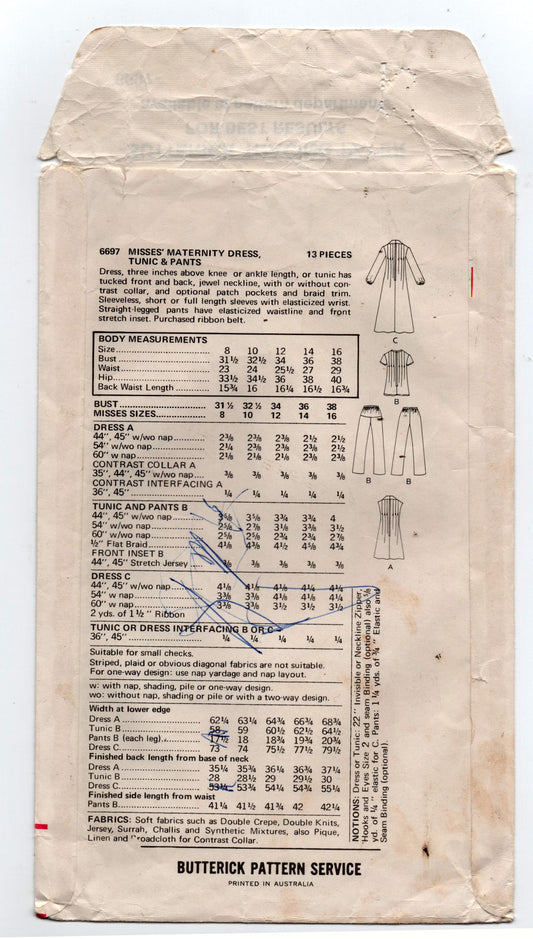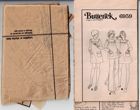 Patrón de costura vintage de los años 70 para vestido de maternidad Butterick 6959, túnica, top y pantalones, talla 14, busto 36 pulgadas