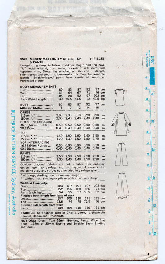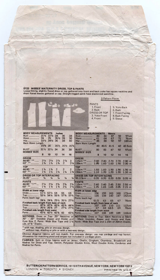 Patrón de costura vintage de los años 70 para vestido y pantalón de maternidad con mangas abullonadas Butterick 5723 para mujer, talla 10