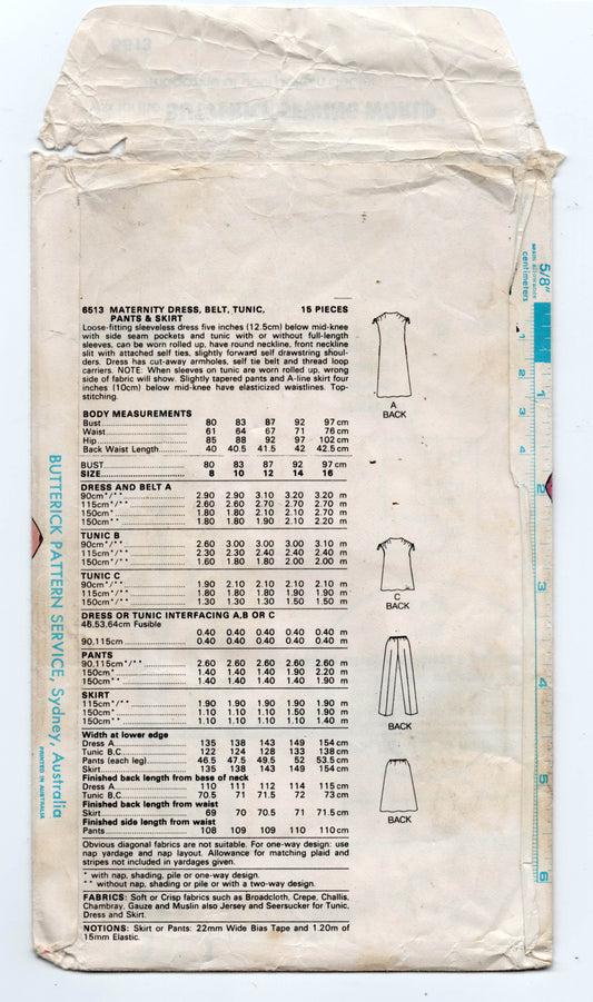 Patrón de costura vintage de los años 80 Butterick 6513 para vestido de maternidad con hombros fruncidos, falda, cinturón y pantalones, talla 12, sin cortar, doblado de fábrica