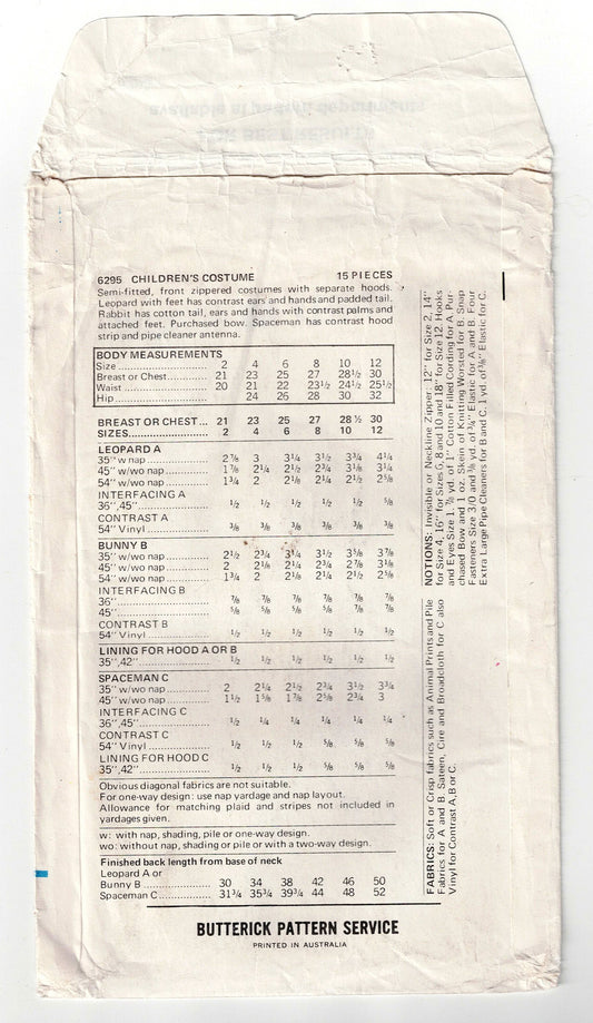 Butterick 6295 Boys & Girls Costumes Rabbit Leopard & Spaceman 1970s Vintage Sewing Pattern Sizes 6 UNCUT Factory Folded
