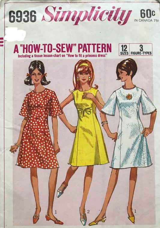 Simplicity 6936 Teen Girls Bell Sleeved Princess Dress 1960s Vintage Sewing Pattern Size 12 Bust 32 inches