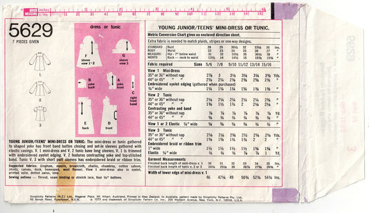 Simplicity 5629 Young Junior / Teens Yoked Smock Top or Mini Dress 1970s Vintage Sewing Pattern Size 11/12 Bust 32 inches