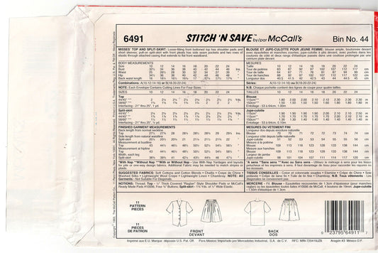 McCall's 6491 Womens Button Front Blouse & Split Skirt 1990s Vintage Sewing Pattern Size 10 - 16 UNCUT Factory Folded