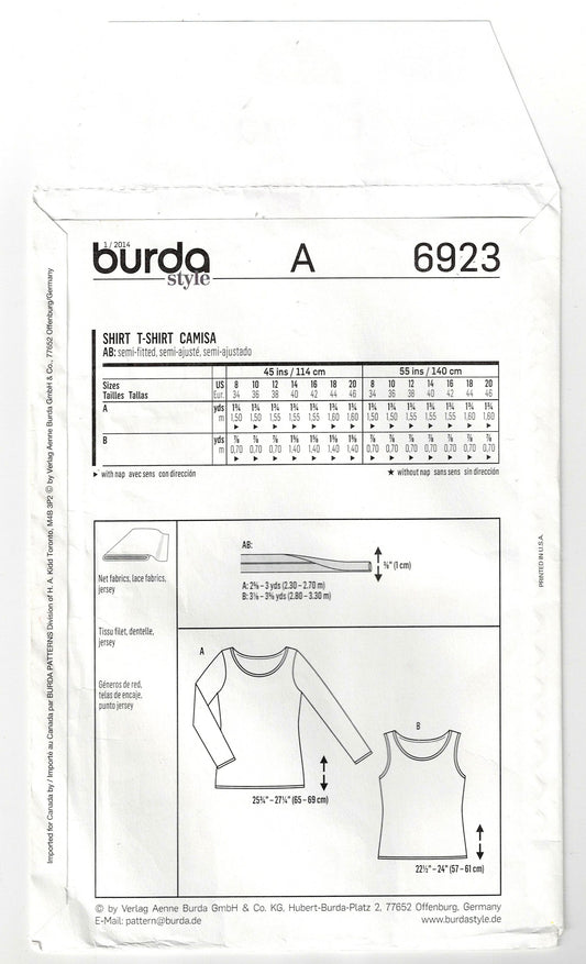 Burda Young 6923 Womens Stretch Knit Tops Out Of Print Sewing Pattern Sizes 8 - 20 UNCUT Factory Folded