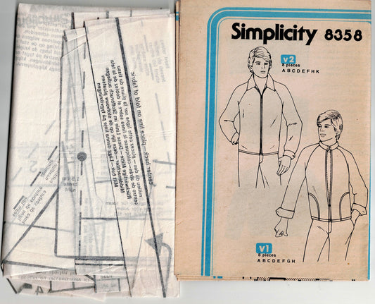 Patrón de costura vintage de los años 70 para chaqueta cortavientos con mangas raglán JIFFY para hombre Simplicity 8358, talla mediana, pecho de 38 a 40 pulgadas