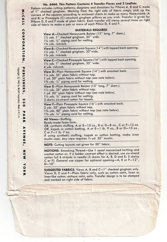 Patrón de costura vintage de los años 60 sin cortar, doblado de fábrica, para cojines y almohadones de cuadros vichy fruncidos retro 6464 de McCall