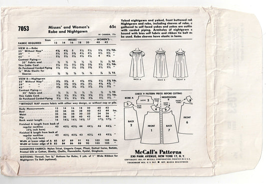 Patrón de costura vintage para bata y camisón con mangas abullonadas para mujer McCall's 7053, años 60, talla 12, busto 32 pulgadas
