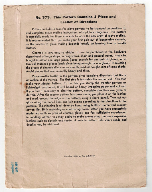 McCall 373 RARE Womens Leather Sports Gloves 1930s Vintage Kaumagraph Transfer Sewing Pattern Size Medium UNCUT Factory Folded