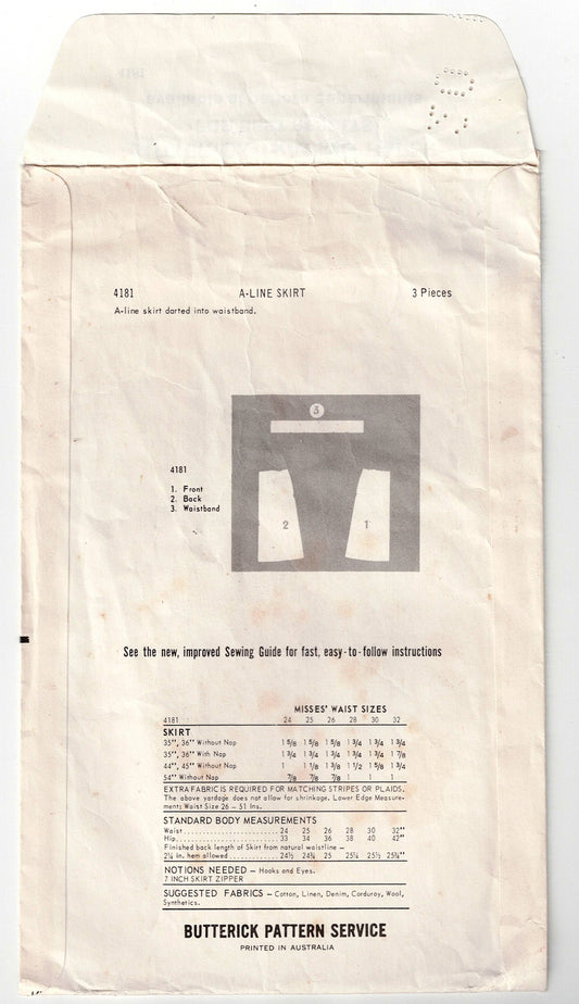 Patrón de costura vintage de los años 60 para falda en forma de A para mujer Butterick 4181, cintura de 26 pulgadas