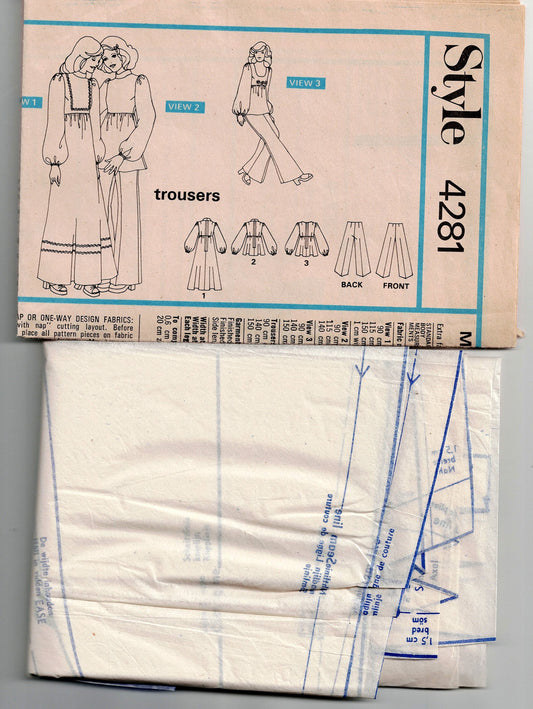 Style 4281 Womens High Waisted Smock Top Maxi Dress & Wide Leg Pants 1970s Vintage Sewing Pattern Size 10 Bust 32.5 Inches