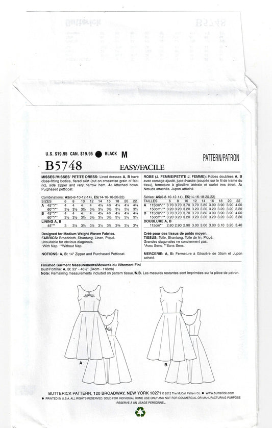 Patrón de costura para vestido de falda amplia con espalda baja de Butterick 5748, reeditado en los años 60, para mujer, talla 14-22, sin cortar, pliegues de fábrica