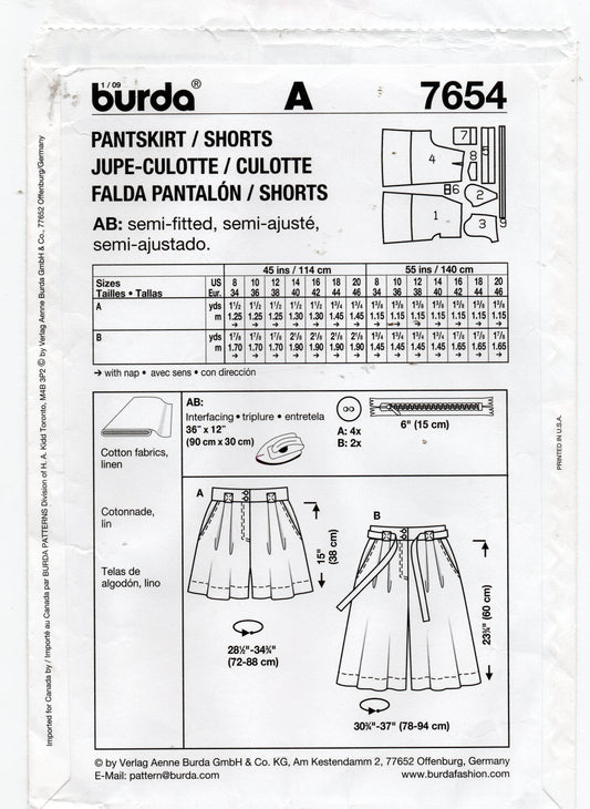 Burda 7654 Patrón de costura de pantalones cortos y culottes plisados para mujer, agotado, tallas 8 a 20, sin cortar, doblado de fábrica