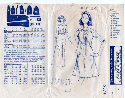 Patrón de costura vintage de los años 70, blusa y falda tipo cárdigan, vestido camisero largo para mujer, pedido por correo 5874, busto de 34 pulgadas, doblado de fábrica SIN USAR