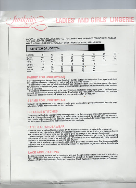 Patrón de costura vintage de los años 80 para lencería, calzoncillos, camisolas, etc., para mujeres y niñas de Justknits, tallas 8 a 22 y niñas de 2 a 12 años, doblado de fábrica y sin cortar
