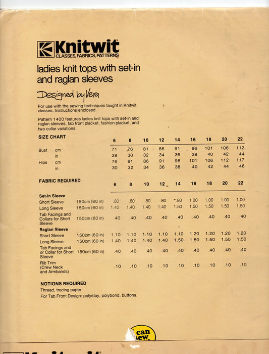 Patrón de costura vintage de los años 80 Knitwit 1400 para blusas de punto elásticas para mujer con mangas raglán o ajustadas, tallas 6 a 22, doblado de fábrica sin cortar