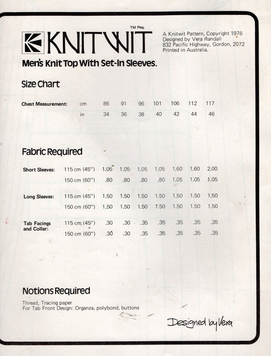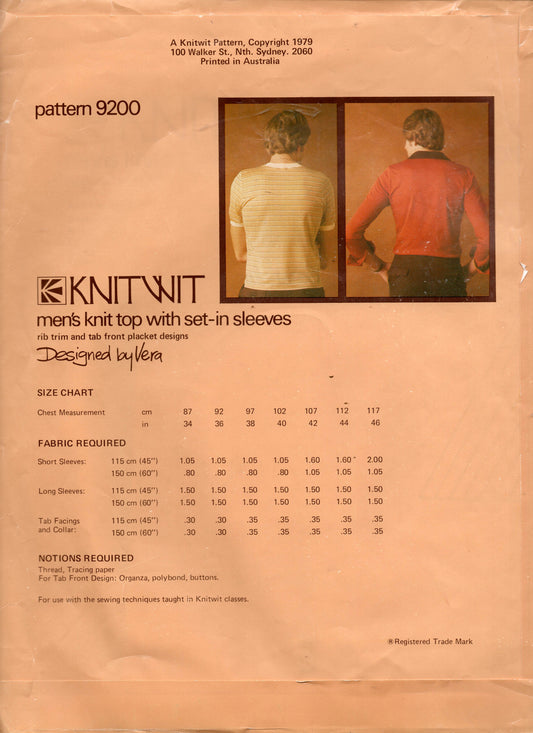 Patrón de costura vintage de los años 70 para sudaderas y camisas de hombre Knitwit 9200, talla 34-46, sin cortar, doblado de fábrica