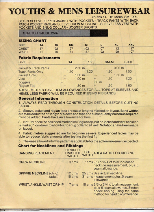 Patrón de costura vintage de los años 80 para chándal de ocio para hombres jóvenes Justknits, pantalones cortos y chaqueta, talla S-XXL, sin cortar, doblado de fábrica