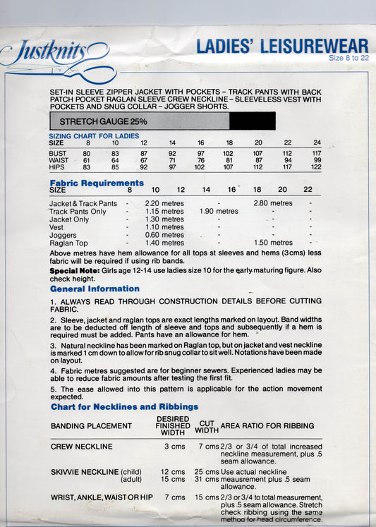 Patrón de costura vintage de los años 80 para chándal de ocio elástico para mujer Justknits, chaleco y pantalones cortos, tallas 8 a 22, sin cortar, doblado de fábrica