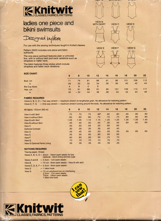 Trajes de baño de una pieza para mujer Knitwit 5800, patrón de costura vintage de los años 80, tallas 6 a 22, patrón maestro sin cortar