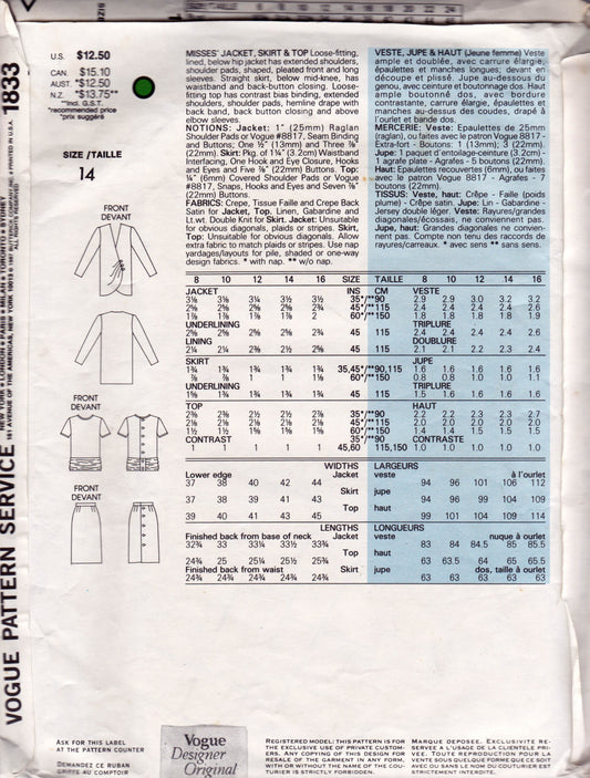 Patrón de costura original de la década de 1980 para falda, blusa y chaqueta con forma de tulipán de Bellville Sassoon, diseñador de Vogue, 1833, sin cortar, doblado de fábrica