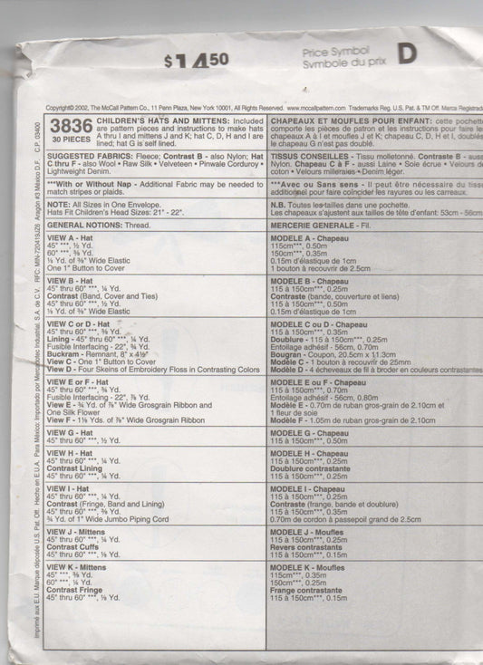 Patrón de costura agotado para gorros, gorras y manoplas para niños McCall's 3836, doblado en fábrica y sin cortar