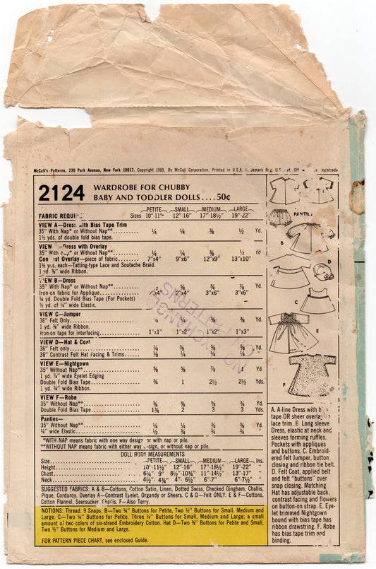 Ropa para muñecas retro McCall's 2124, ropa para muñecas de 17 a 18,5 pulgadas, patrón de costura vintage de los años 60, sin cortar, doblada de fábrica