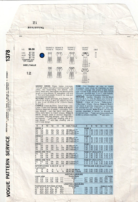 Vogue Basic Design 1378 Womens Dropped Waist Dress with Sleeve & Skirt Variations 1980s Vintage Sewing Pattern Size 12 Bust 34 Inches UNCUT Factory Folded