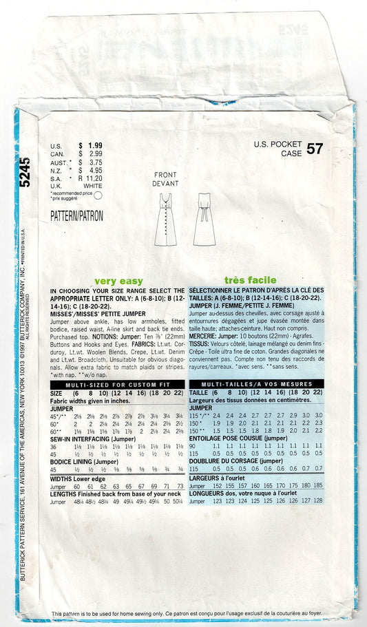 Patrón de costura vintage de los años 90 para vestido estilo pichi con botones delanteros y cintura alta para mujer Butterick See & Sew 5245, talla 12-16, doblado de fábrica y sin cortar