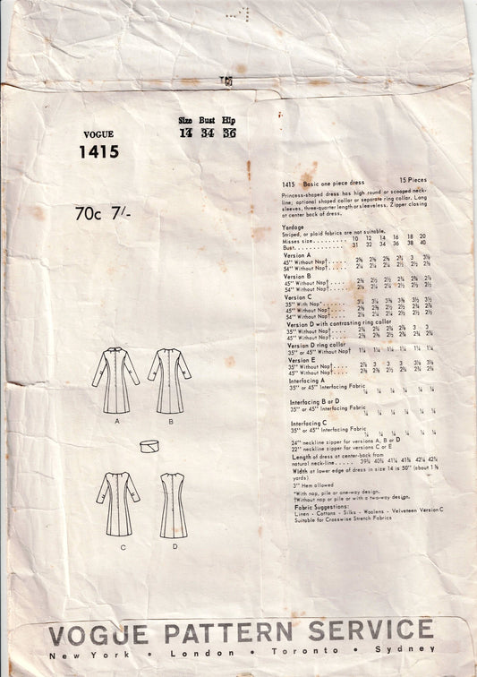 Vogue Basic Design 1415 Womens Classic Princess Dresses 1960s Vintage Sewing Pattern Size 14 Bust 34 inches