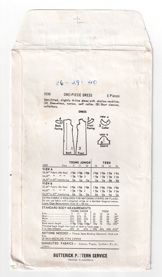 Patrón de costura vintage de los años 60 para vestido recto sencillo con cuello Butterick 3598 para mujer, talla 16, busto de 36 pulgadas