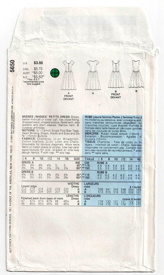 Patrón de costura Butterick 5650 para vestido de verano informal de talle bajo para mujer, años 80, talla 6 a 10, sin cortar, doblado de fábrica