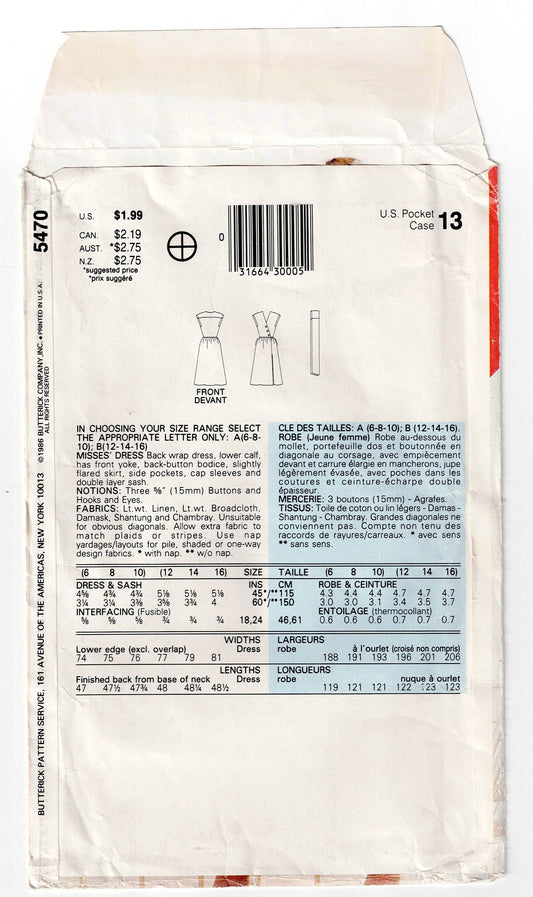 Patrón de costura vintage de los años 80 para vestido de verano cruzado en la espalda para mujer Butterick See & Sew 5470, talla 12-16, sin cortar, doblado de fábrica