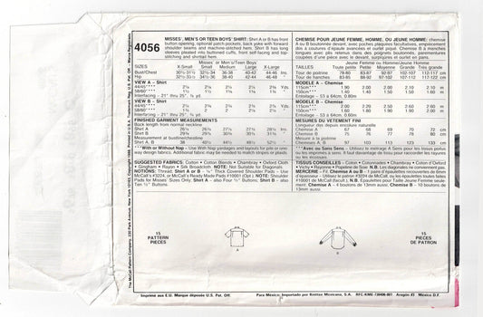 Patrón de costura vintage de los años 80 para camisas clásicas de 3 horas PALMER PLETSCH unisex para hombre y mujer de McCall's 4056, talla pequeña, sin cortar, doblada de fábrica