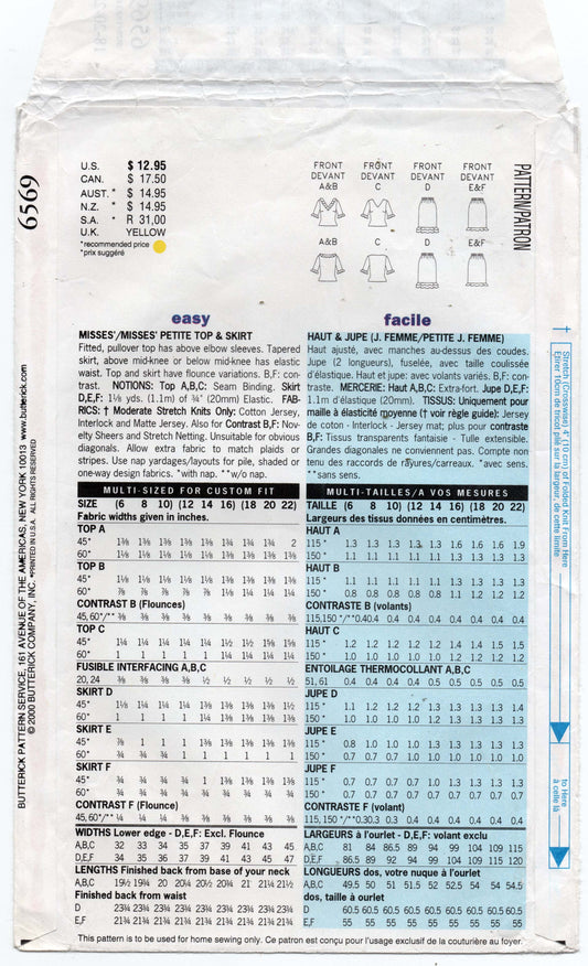 Patrón de costura de blusa y falda de noche con volados para mujer Butterick 6569, agotado, talla 12-16 o 18-22, sin cortar, doblado de fábrica
