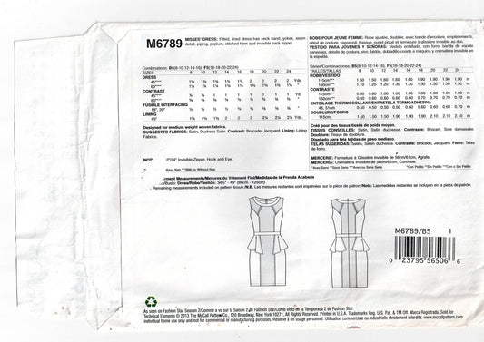 Patrón de costura agotado para vestido con peplum y bloques de color FASHION STAR 6789 de McCall, para mujer, tallas 8 a 16, sin cortar, doblado de fábrica