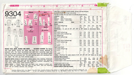 Simplicity 9304 DESIGNER Womens Vest Skirt Blouse & Pants 1970s Vintage Sewing Pattern Size 12 Bust 34 Inches UNCUT Factory Folded