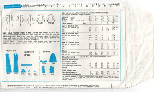 Style 3824 Girls Pinafore Dress & Blouse 1970s Vintage Sewing Pattern Size 10