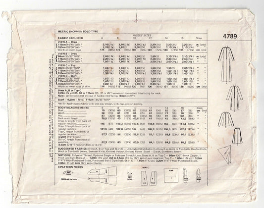 McCall's 4789 Womens Stretch Knit Dress Top Scarf & Skirt 1970s Vintage Sewing Pattern Size 12 Bust 34 Inches