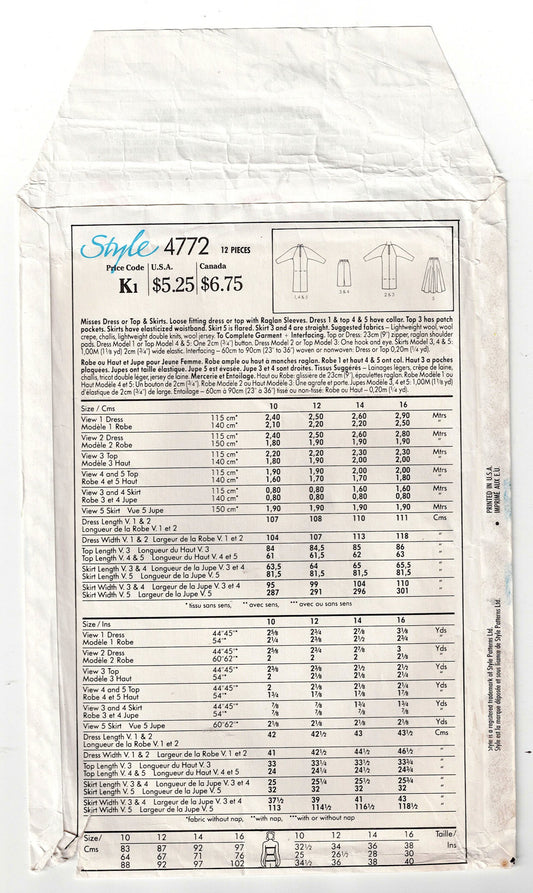 Style 4772 Womens Raglan Sleeved Dress Top & Skirt 1980s Vintage Sewing Pattern 12 - 16 UNCUT Factory Folded