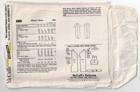 McCall's 6805 Womens Classic Raglan Sleeved Sheath Dress 1960s Vintage Sewing Pattern Size 16 Bust 36 inches