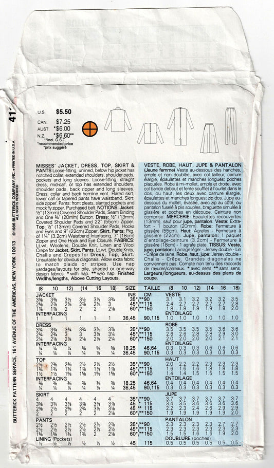 Butterick 4114 Womens Dress Top Skirt & Pants 1980s Vintage Sewing Pattern Size 14 - 18 UNCUT Factory Folded